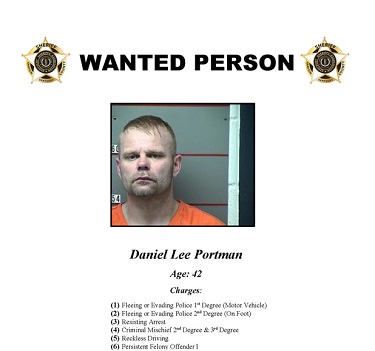 The Grayson County Sheriff’s Office captured 42-year-old Daniel L. Portman on Sunday. Portman was wanted for two counts of fleeing or evading police (motor vehicle, on foot), resisting arrest, reckless driving, and first-degree persistent felony offender.