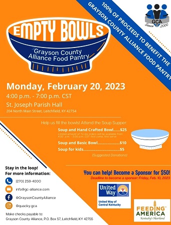 The sixth annual Empty Bowls fundraiser for Grayson County Alliance (GCA) Food Pantry will be held Monday at St. Joseph Parish Hall in Leitchfield.