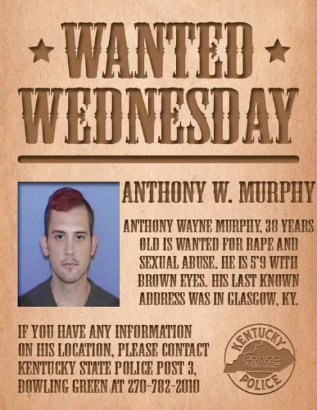 Kentucky State Police and the Bowling Green Police Department are searching for 40-year-old Anthony W. Murphy. He is wanted for first-degree rape and first-degree sexual abuse of a child under the age of 12.